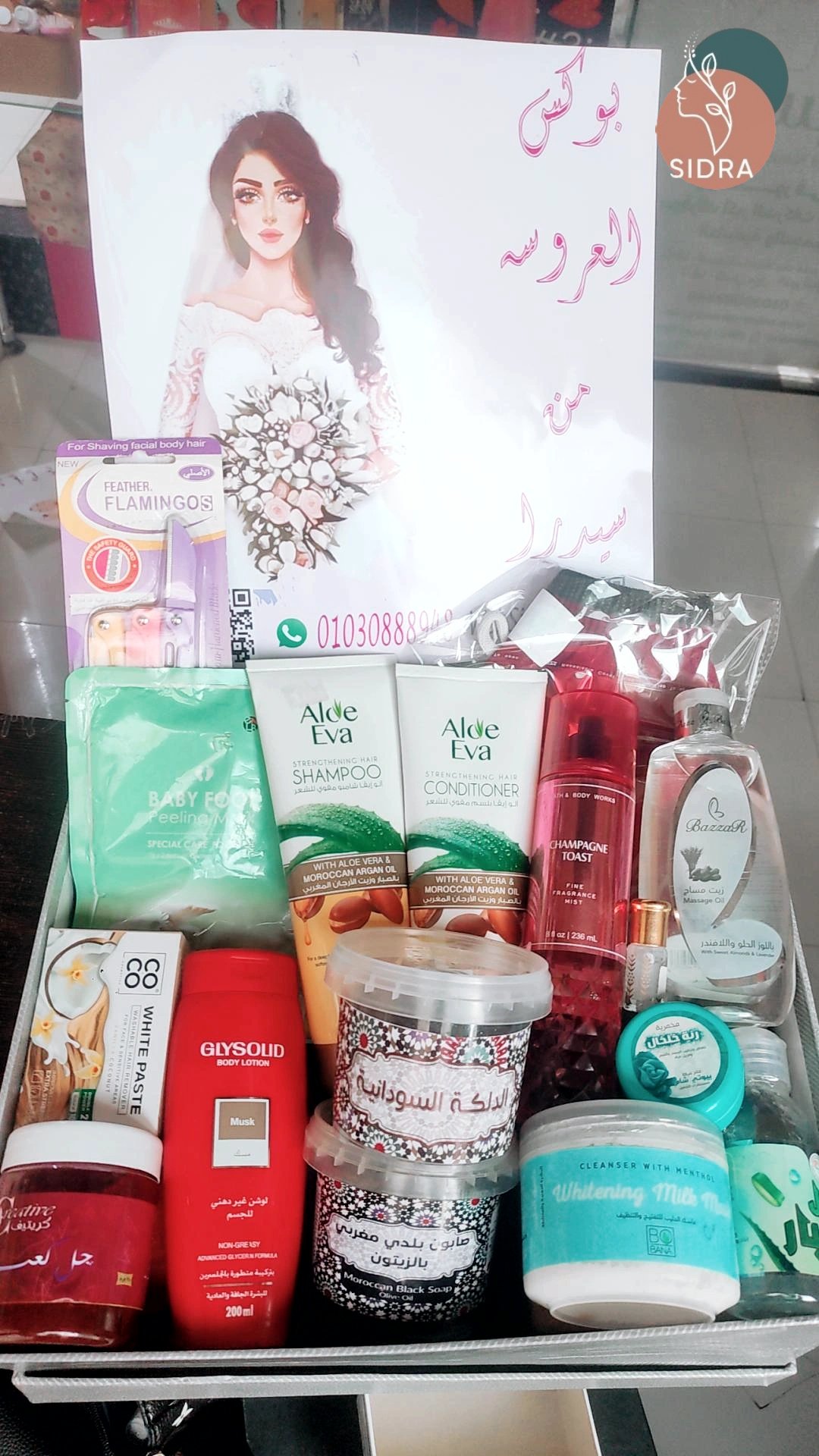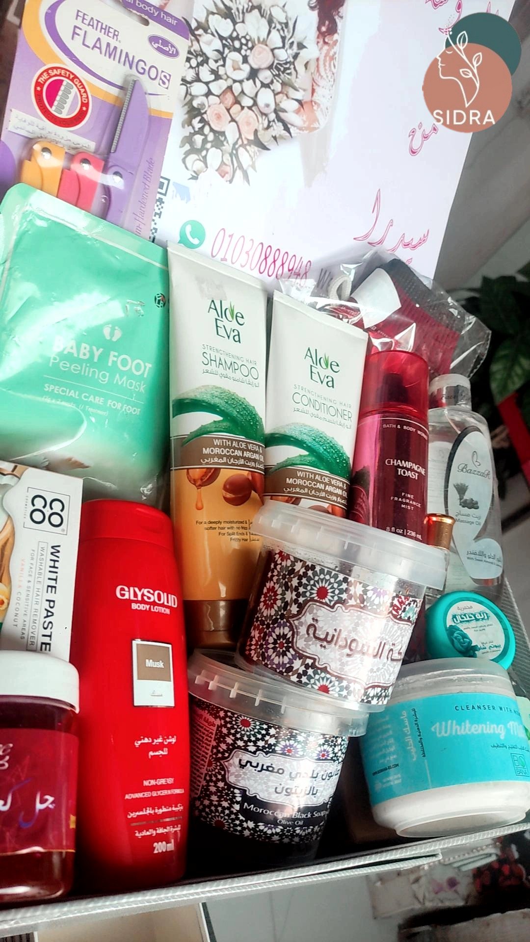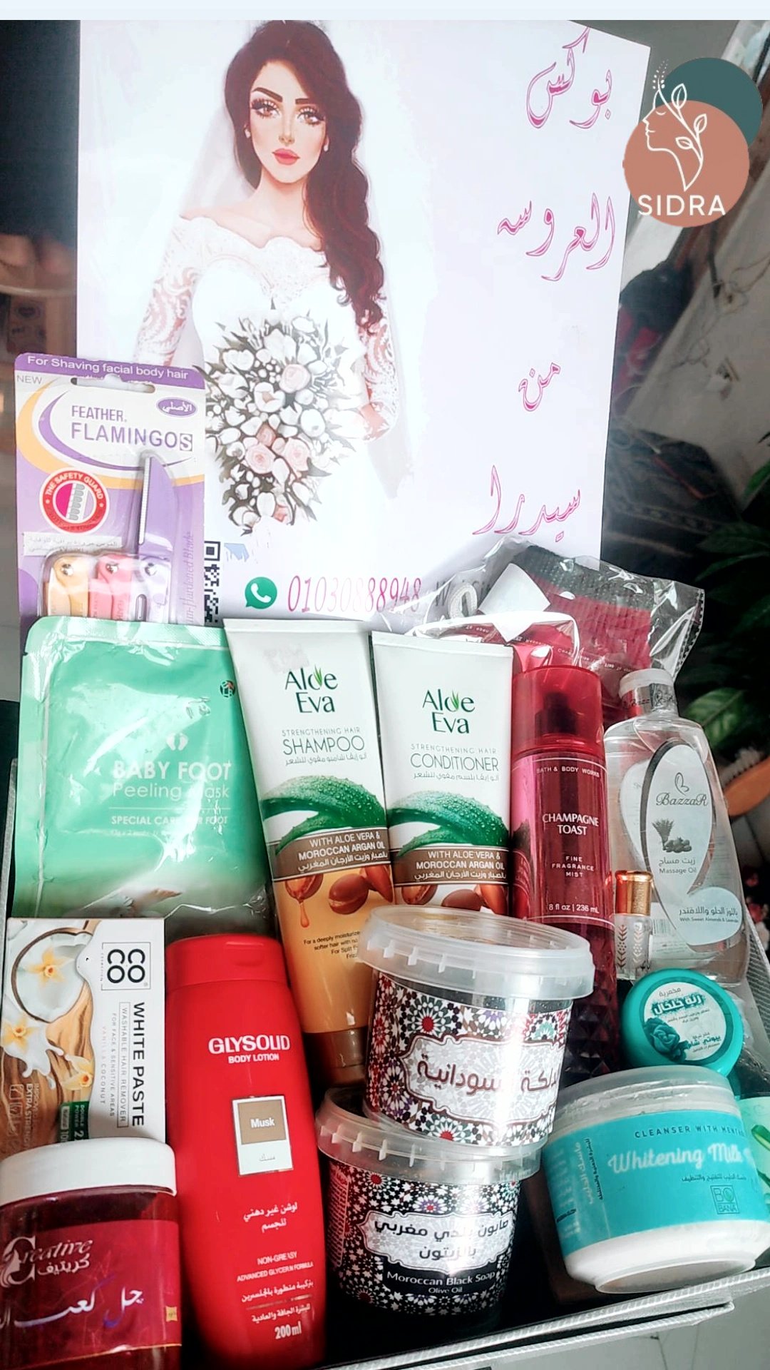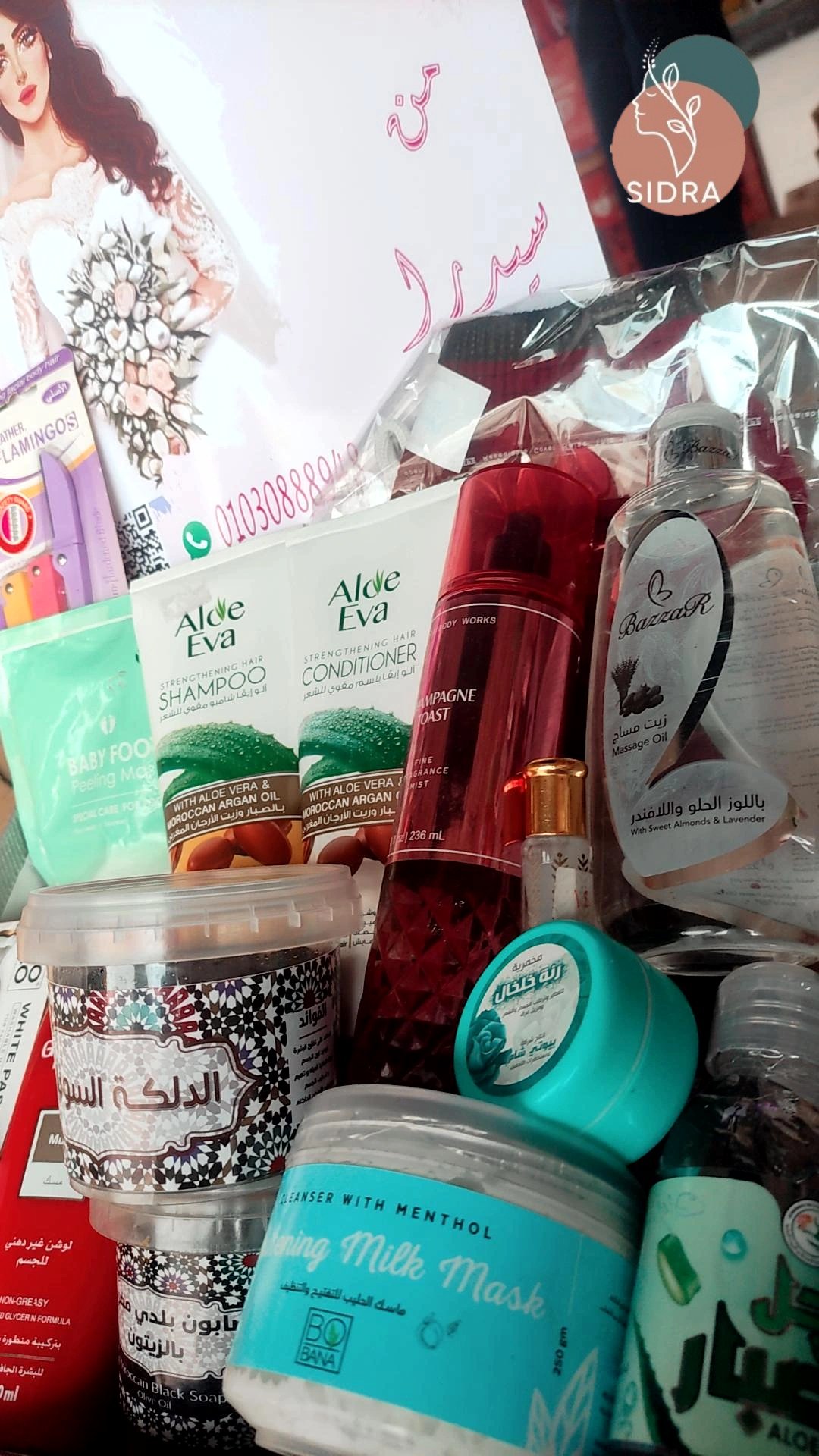 مكون من ( صابون مغربي اصلي و ليفة مغربية اصلية و دلكة سودانيه اصلية و شامبو وبلسم ايفا و شفرات للبشرة و عجينة بيضاء لإزالة الشعر و جيل كعب غزال و جيل صبار و بدي سبلاش اماراتي و زيت مساج اصلي و مسك طهارة و ماسك تفتيح للبشرة و مخمرية و لوشن للجسم و ماسك كوري للقدم )